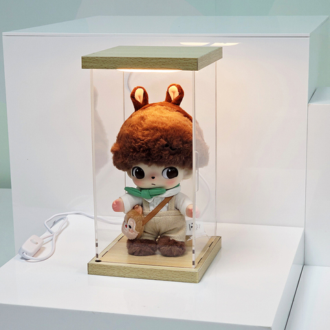 卸売モダンクリアアクリル5-6インチカスタマイズ可能なサイズの人形ディスプレイケース木制ベース